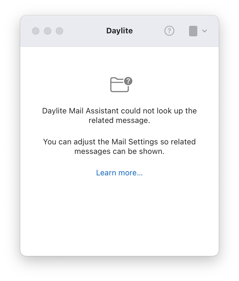 When selecting an email within a conversation in Mail, the Daylite Mail Assistant shows a message that the Daylite Mail Assistant could not look up the related message.