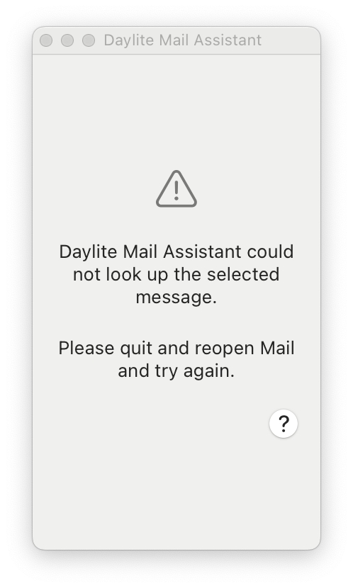 In certain circumstances, such as when an email fails to load, the Daylite Mail Assistant crashes or some data is not sent to the Daylite Mail Assistant correctly, you will see the following message indicating that the Daylite Mail Assistant could not look up the selected message. Follow the steps below to resolve this message and reduce its frequency.