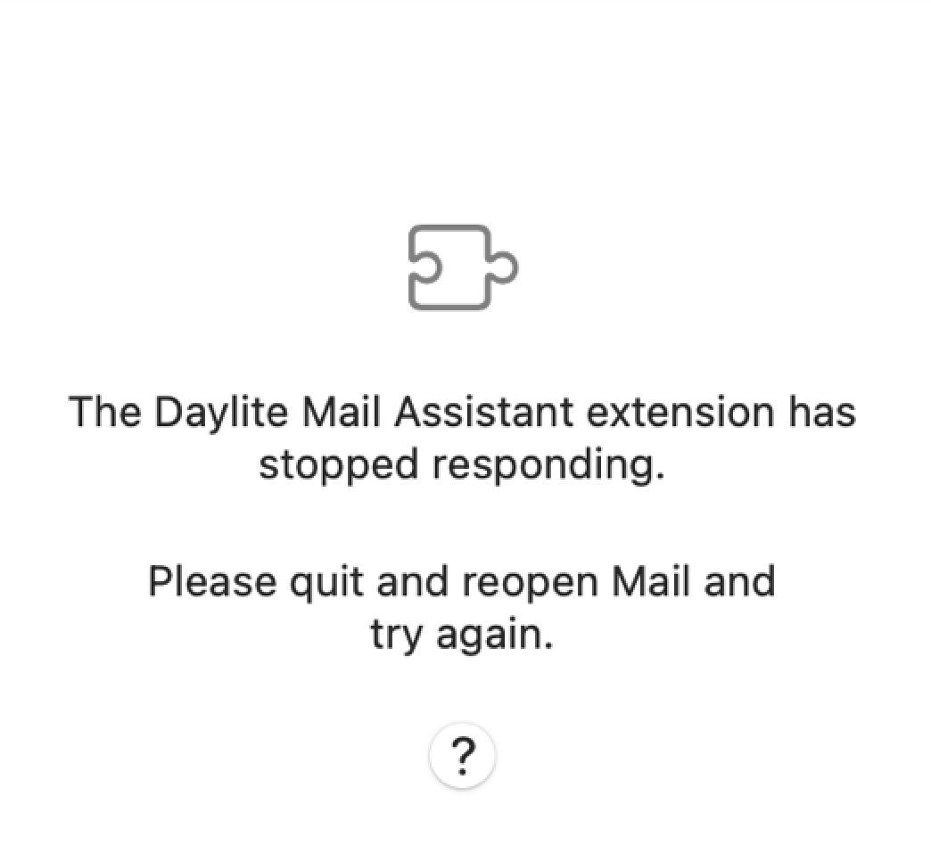 When Daylite Mail Assistant and Apple Mail have stopped communicating, you will receive a message indicating that Daylite Mail Assistant has stopped responding.