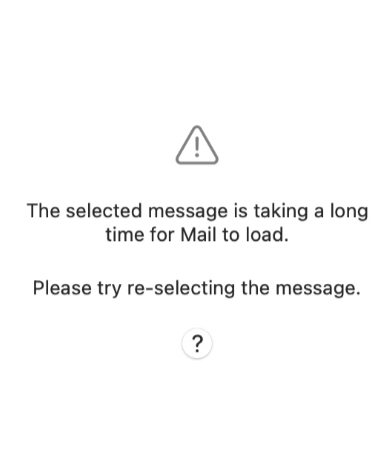This can occur with lengthy email threads or emails with large attachments. This problem arises because Apple Mail tries to download the entire message again, even if it was previously downloaded with a Mail extension. As a result, all messages might load slower than usual, causing this message to appear.