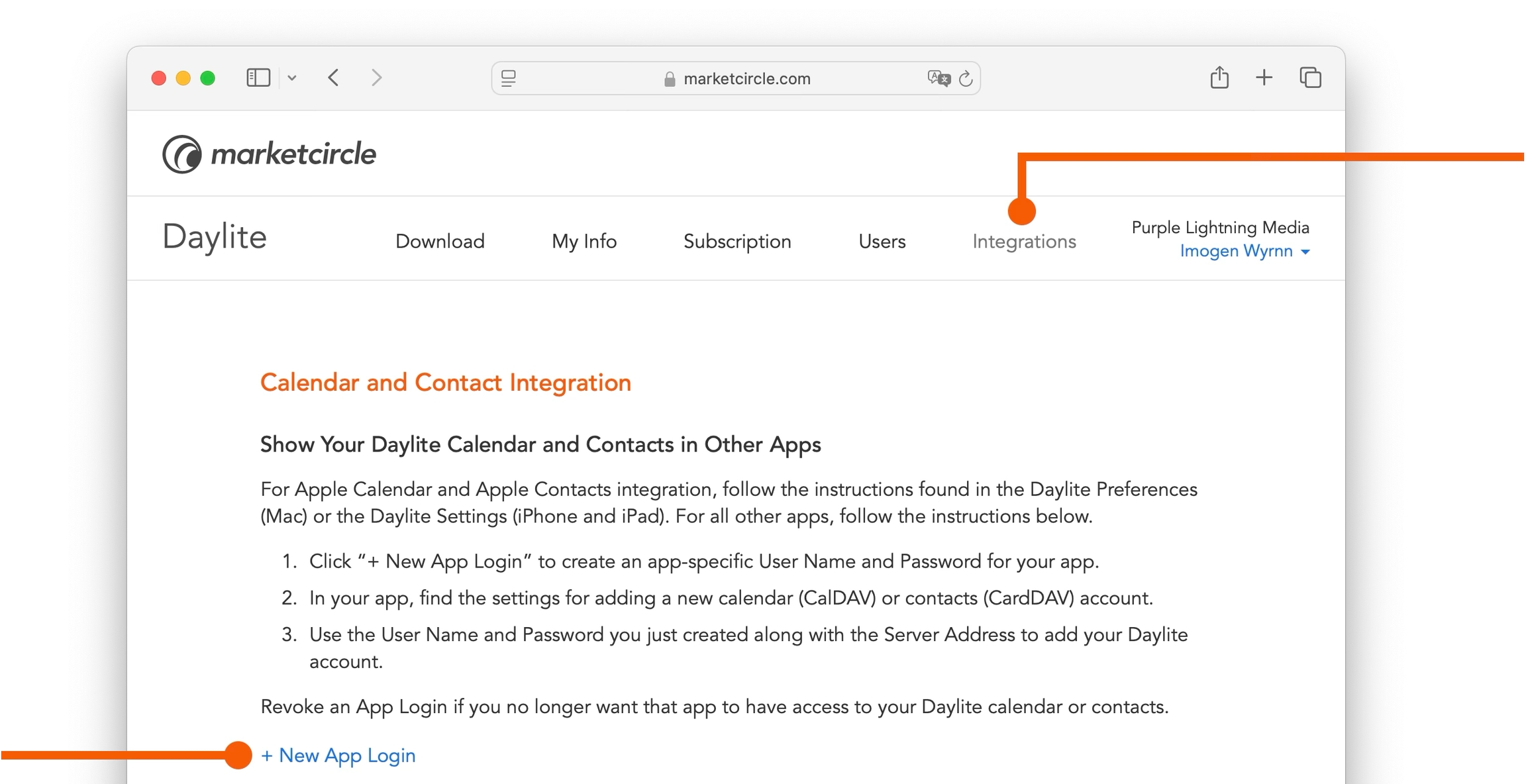 When you share your Daylite calendar, you create a unique app-specific username and password. This allows you to securely connect your Daylite calendar to other applications, like Apple Calendar, without using your main account credentials.