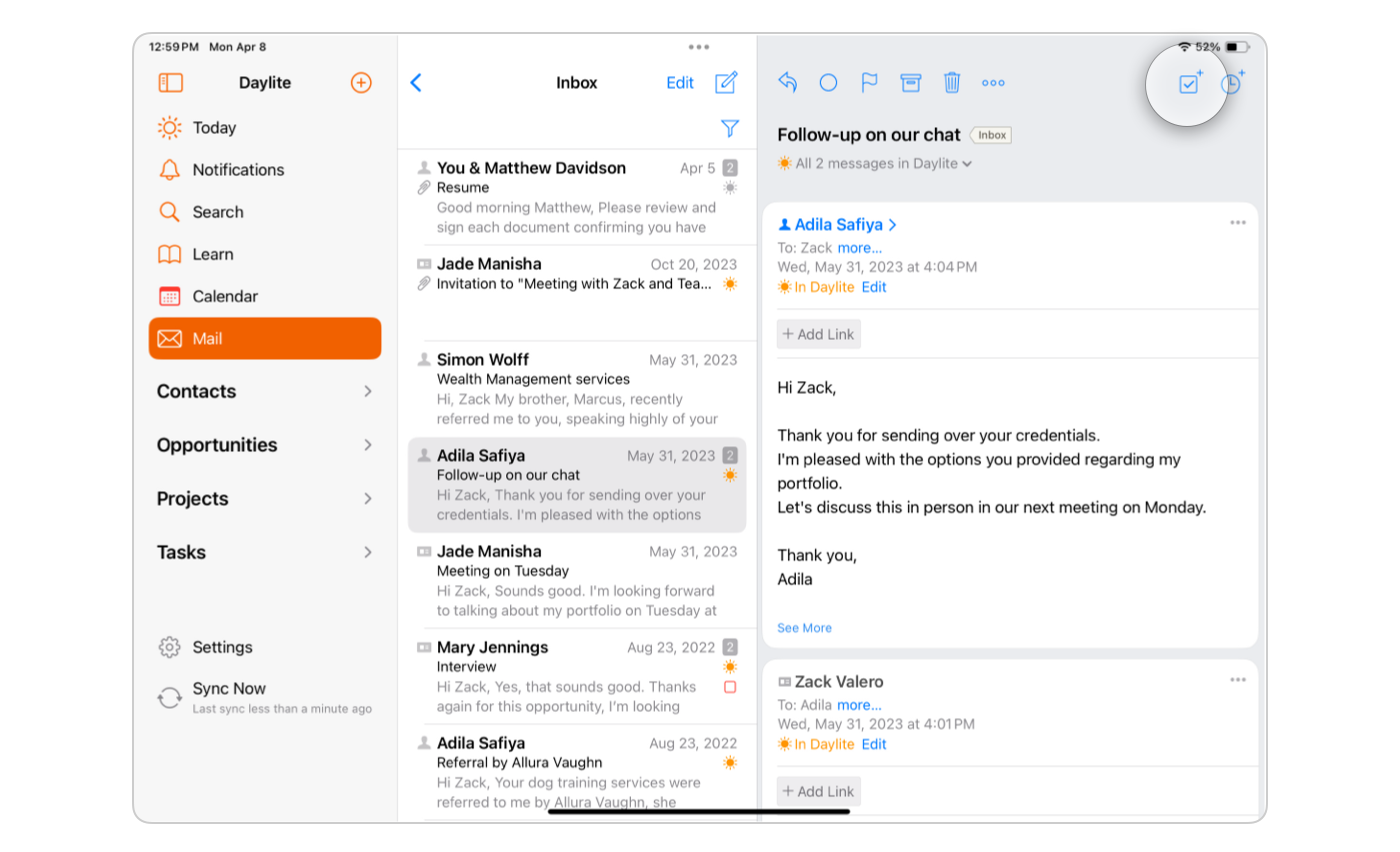 * Select the email you wish to delegate and tap **Add to Daylite**. It will turn to an orange with a small sun icon and say **In Daylite.**