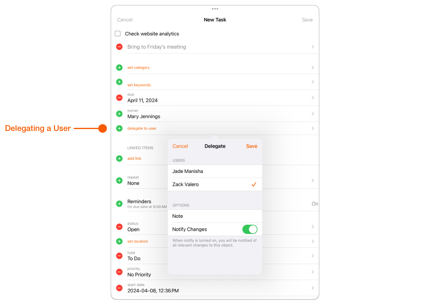 * In the New Task pop up tap d**elegate to user**, then choose the person you want to delegate this Task to.