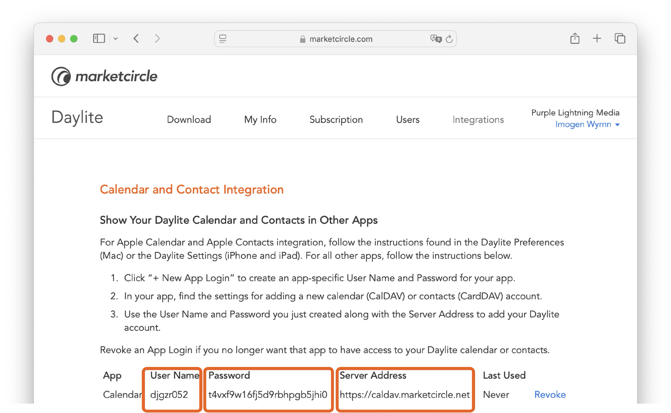 Each time you share your calendar, a new set of credentials is generated. These credentials are specific to your device and application, meaning they won’t affect your main Daylite login. If you need to remove access or update your setup, you can manage these credentials from your Account Manager.