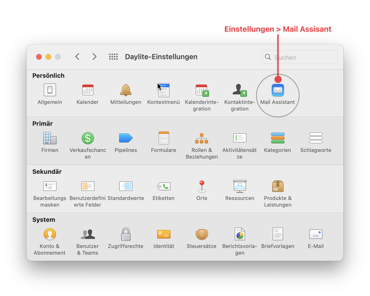1. Navigieren Sie zu **Daylite >Einstellungen > Mail-Assistent**.