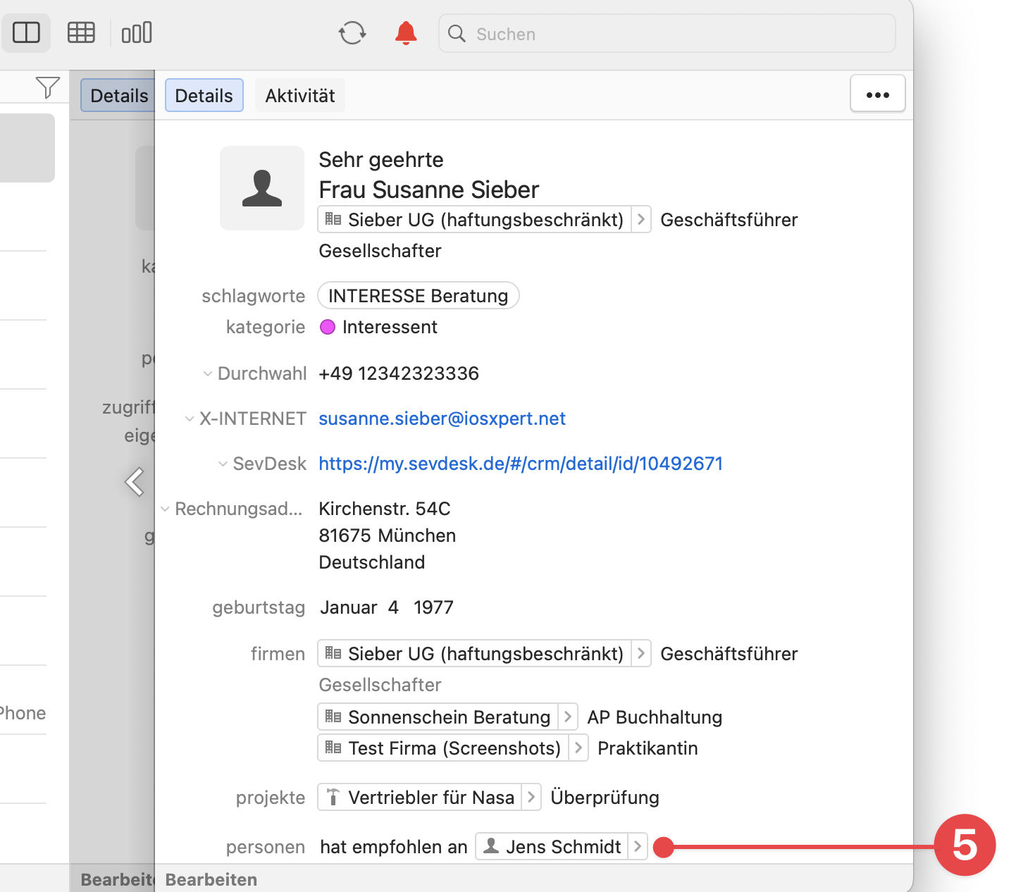 5. Sie werden feststellen, dass auf der Detailkarte des Kontakts des Empfehlers nun auch angezeigt wird, wen er empfohlen hat.