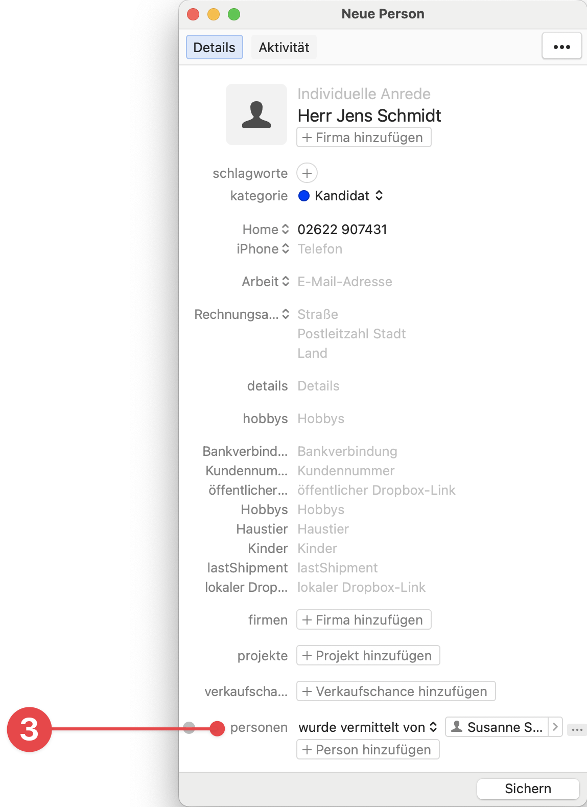 3. Wählen Sie **wurde empfohlen von** aus dem Beziehungsmenü. Sie können in den Daylite-Einstellungen Ihre eigenen Beziehungen einrichten.