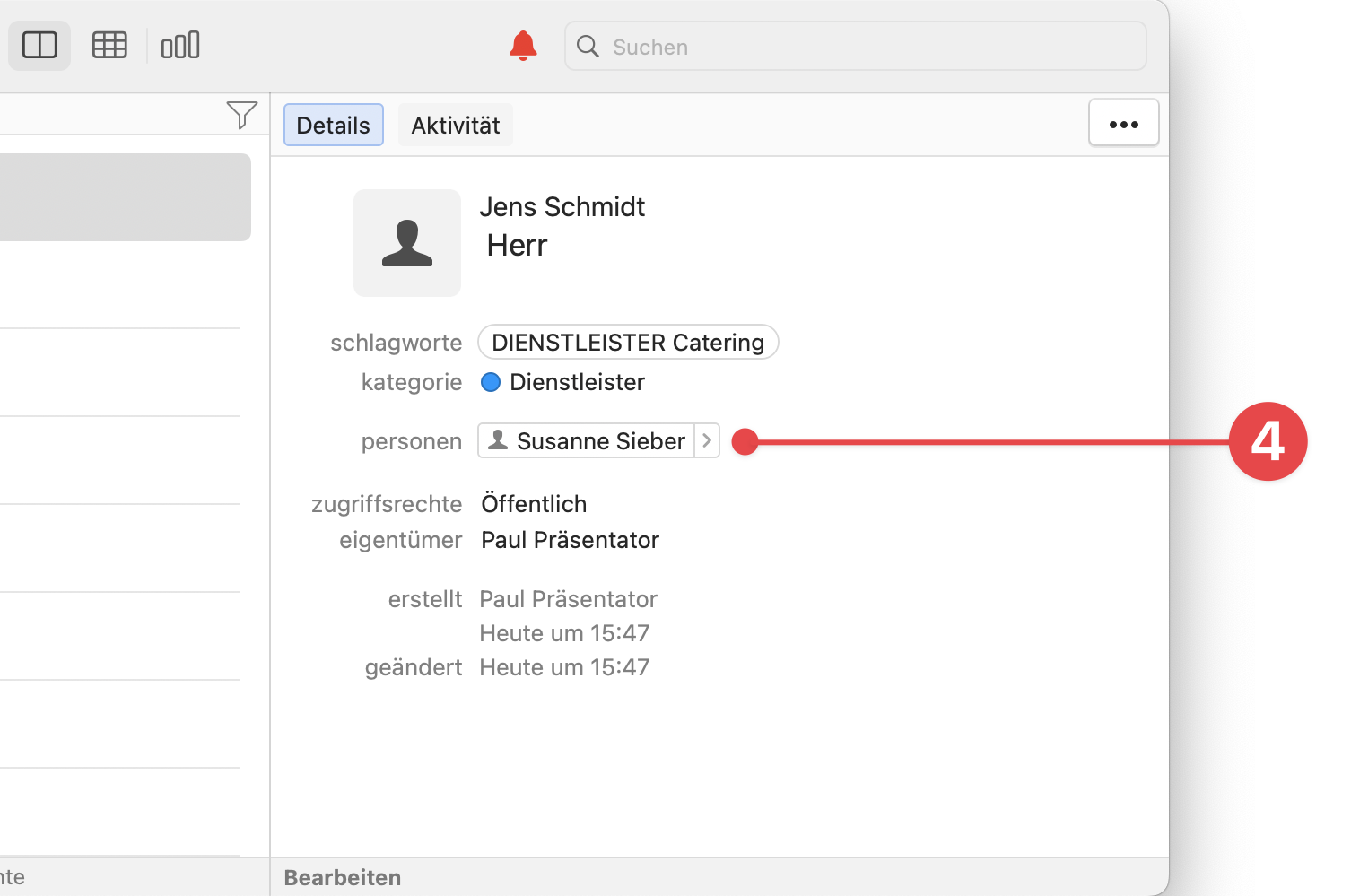 4. Sie können nun sehen, wer Ihren neuen Kontakt empfohlen hat, indem Sie im Detailbereich nach unten zu **Personen** blättern. Klicken Sie auf die Pfeilschaltfläche neben dem Namen des Empfehlers, um den Kontakt anzuzeigen.