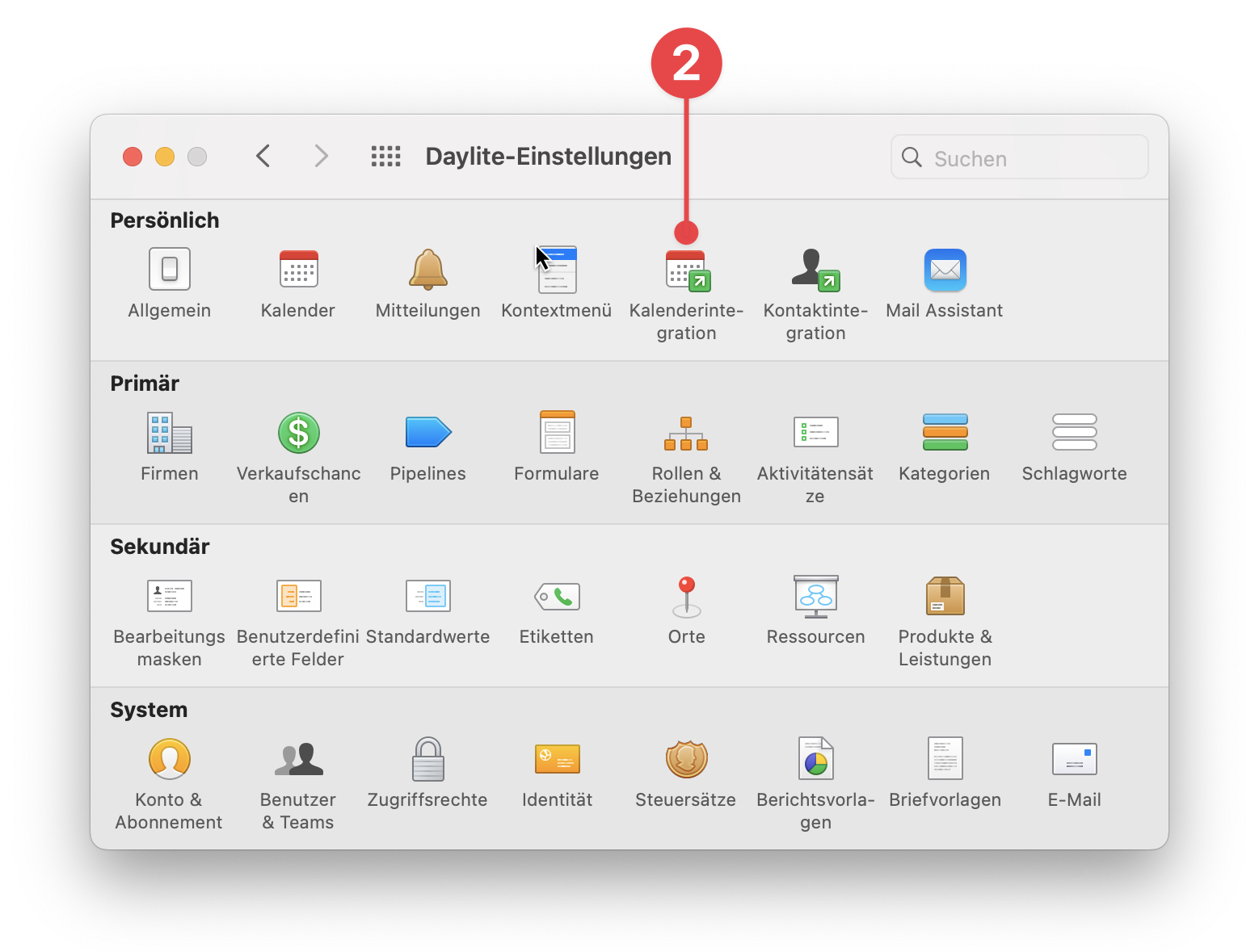 Bevor Sie die leistungsstarken integrierten Kalenderfunktionen von Daylite kennenlernen, müssen Sie die Kalenderintegration in Daylite aktivieren. Auf diese Weise können Sie alle Ihre Kalender aus anderen Anwendungen in Daylite anzeigen und auch andere Kalenderanwendungen Ihre Daylite-Kalendereinträge einsehen lassen.