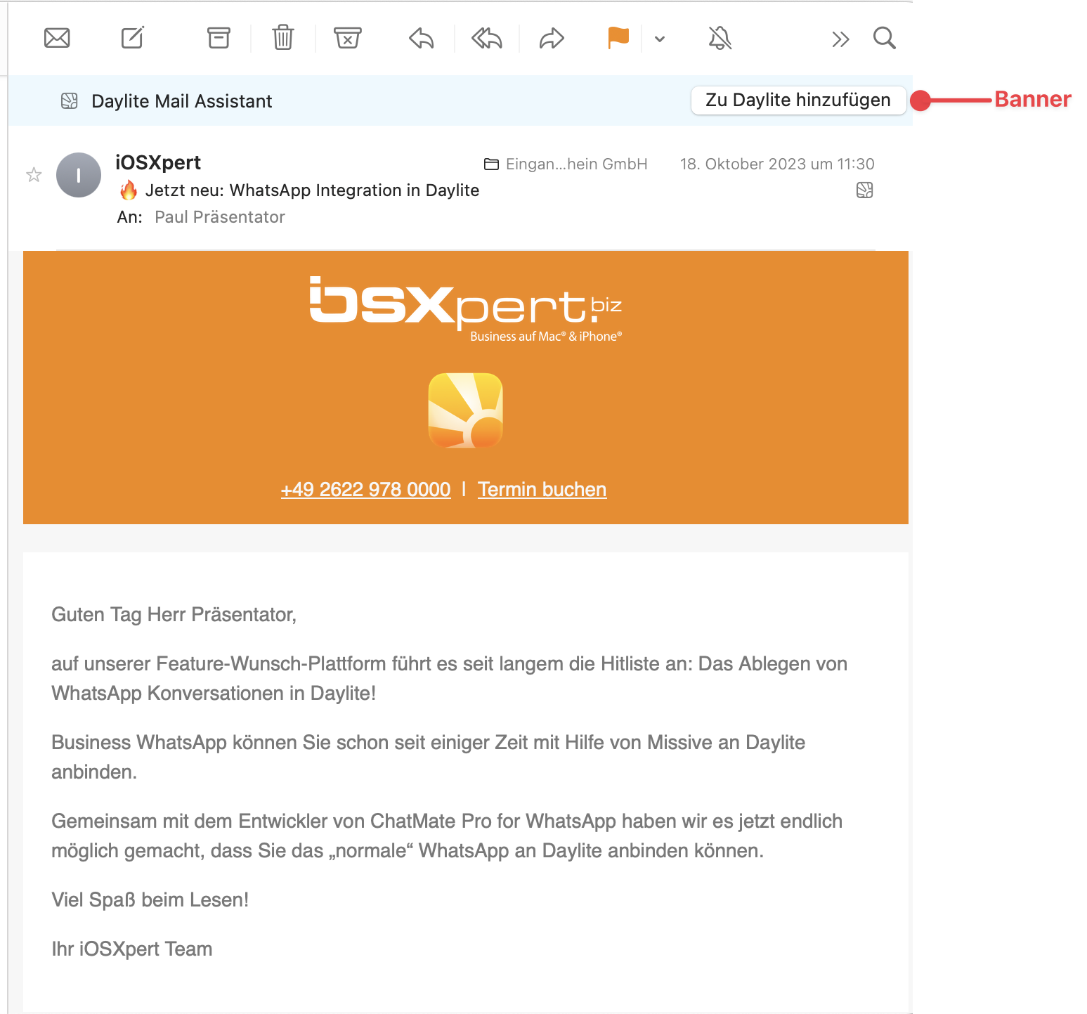 Daylite enthält den Daylite Mail Assistant, eine Erweiterung für die Mail-App auf dem Mac. Mit dem Daylite Mail-Assistenten können Sie die Informationen neuer und bestehender Kontakte direkt aus Ihrem Posteingang erfassen und sie gleichzeitig direkt in der Mail-Anwendung mit der E-Mail verknüpfen. Das Umschalten zwischen verschiedenen Anwendungen kann manchmal Ihren Arbeitsablauf stören, daher bietet Ihnen diese Funktion einen großen Produktivitätsgewinn.