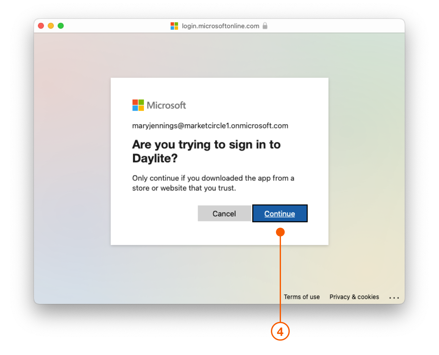 4. Microsoft wird fragen, ob Sie sich bei Daylite anmelden möchten. Wählen Sie **Weiter**.