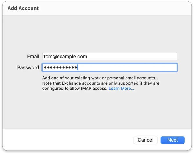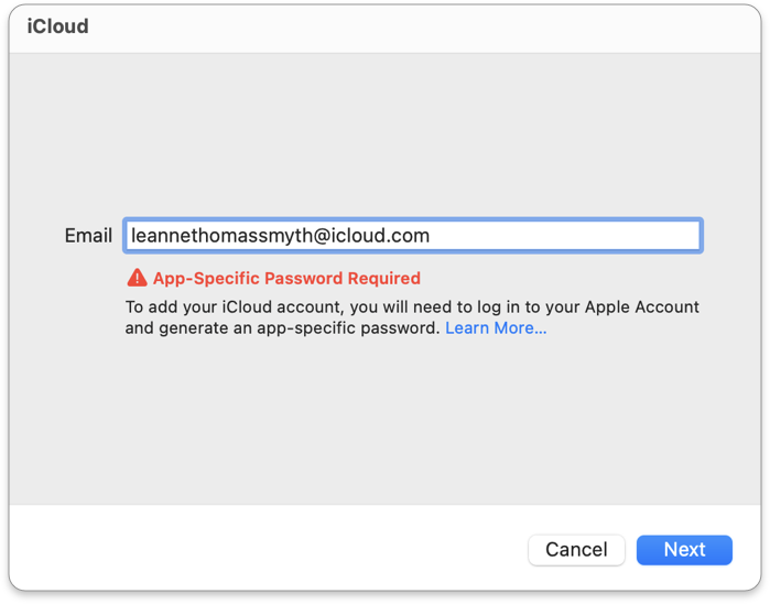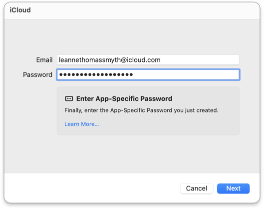 4. Enter your app-specific password in the **Password** field. If you haven't created one, see [Create an App-Specific Password](#create-an-app-specific-password) above.