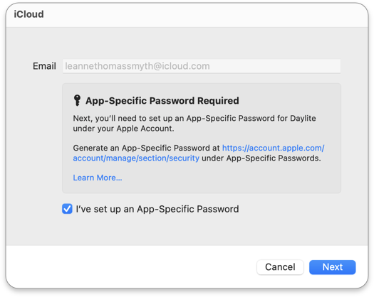 6. Enter the email address of your iCloud account. Daylite requires you to create an **app-specific password**. This is a different password than the one you use to sign into iCloud.