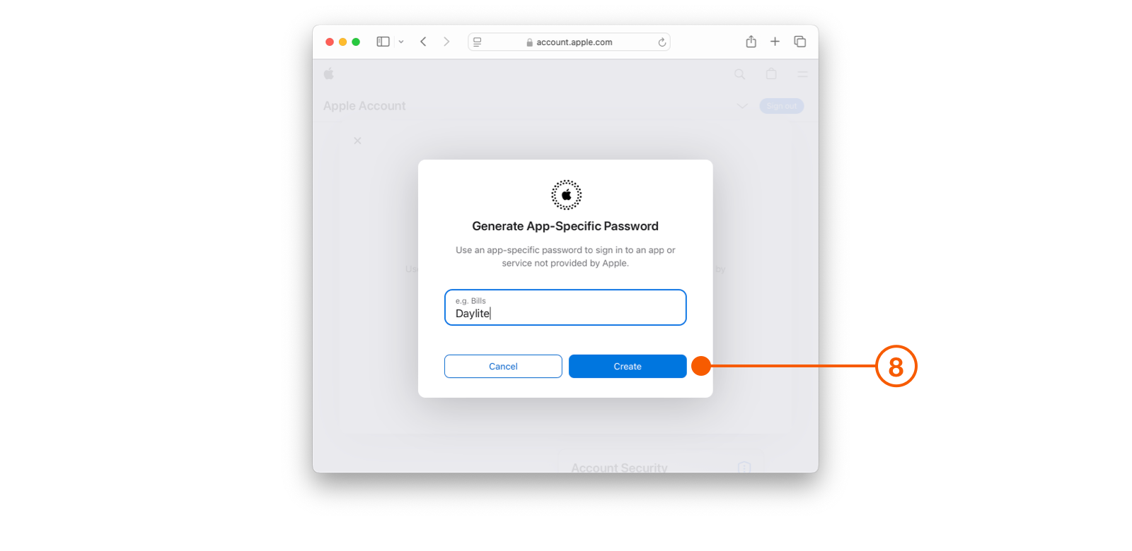 13. Enter "Daylite" for the name of your App-Specific Password, then choose **Create**.<br>