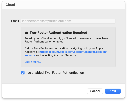 2. Choose **Sign-In and Security** from the Apple Account menu, then select **Account Security** to enable **Two Factor Authentication**. If you need more detailed instructions, follow [this article from Apple](https://support.apple.com/en-us/HT204915).
