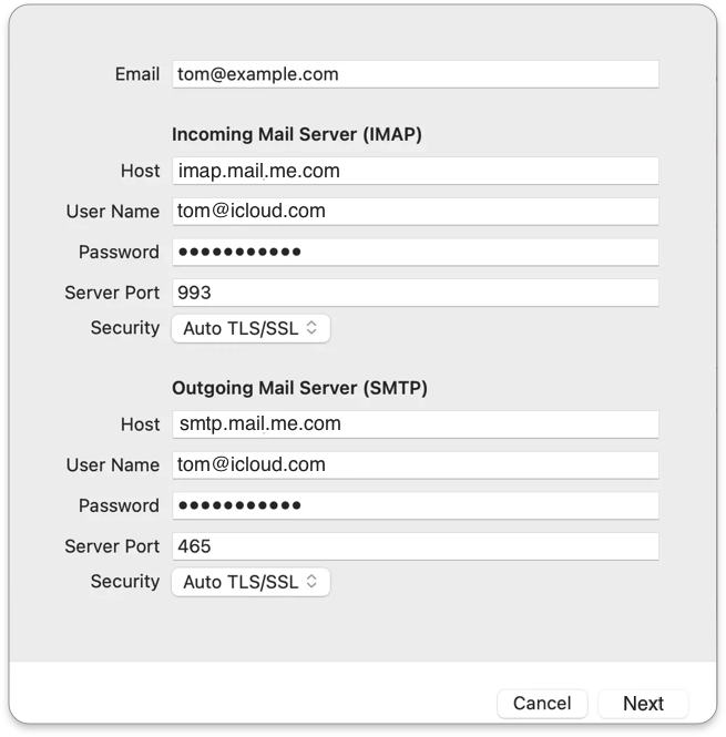 For example: If the **User Name** fields show <tom@example.com>, change them to <tom@icloud.com>.