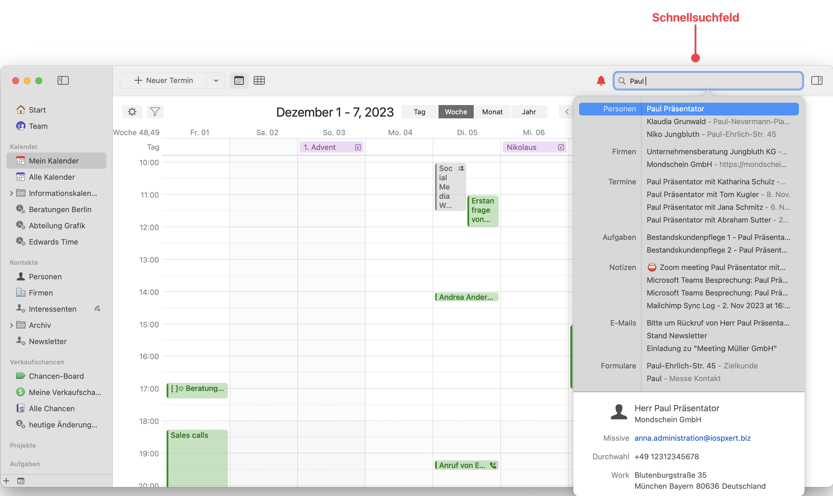 Indem Sie entweder vollständige oder partielle Suchanfragen eingeben, können Sie das Feld **Schnellsuche** nutzen, um das zu finden, wonach Sie in Daylite suchen.