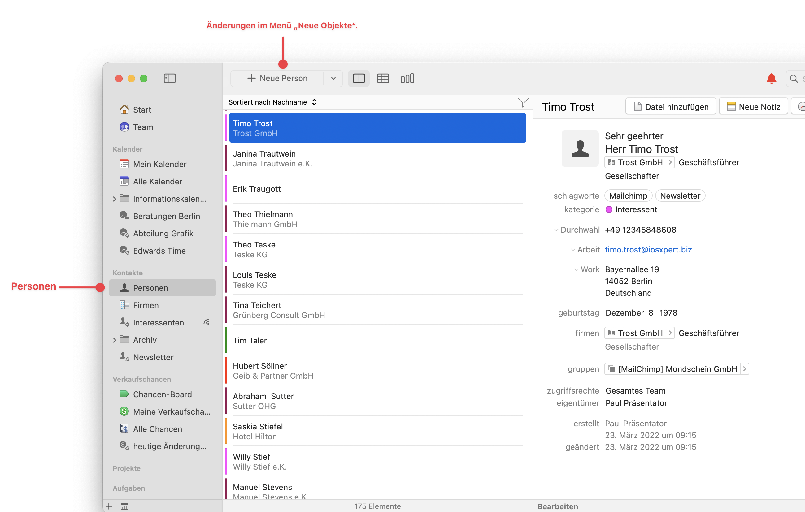 Ändern Sie Ihr Objekt in der Seitenleiste z. B. in Personen, und das Menü "Neues Objekt" bietet nun das Hinzufügen einer **+ neuen Person** anstelle eines **+ neuen Termins** an..