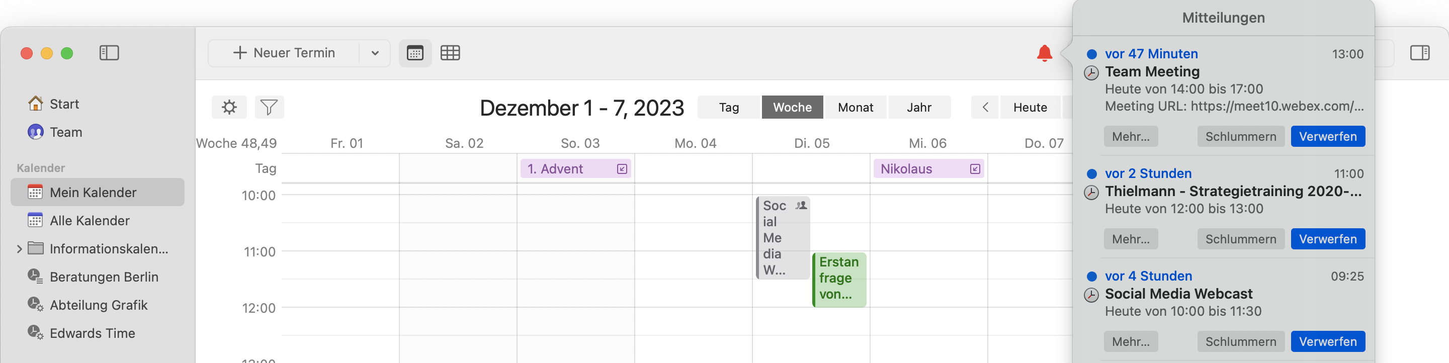Sie können so genannte neue Objekte erstellen, indem Sie auf das Menü **Neues Objekt** klicken. Das Hinzufügen eines neuen Objekts ist nur eine schicke Umschreibung für Dinge wie "Ich möchte eine neue Aufgabe erstellen" oder "Ich möchte einen neuen Kontakt erstellen". Diese Funktion ist kontextabhängig, d.h. wenn Sie den Kalender in der Seitenleiste ausgewählt haben, bietet Ihnen das Menü "Neues Objekt" einen **+ Neuen Termin** an; wenn Sie Kontakte in der Seitenleiste ausgewählt haben, bietet es Ihnen an, eine **+ Neue Person** hinzuzufügen.