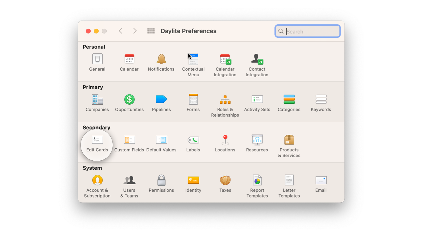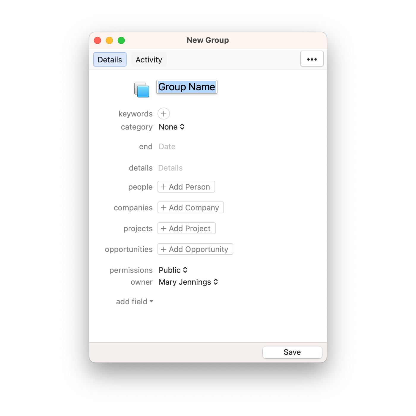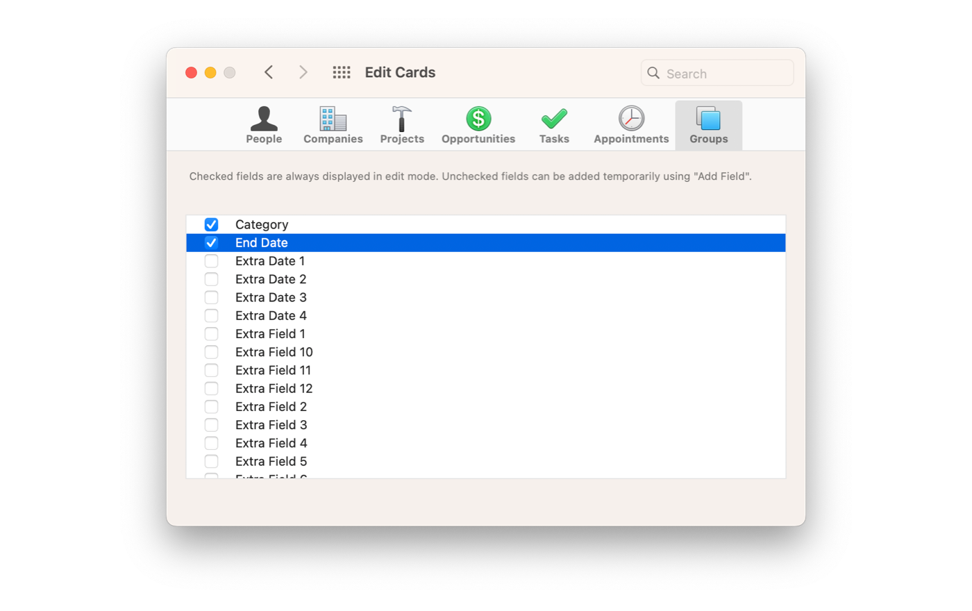By default, Daylite displays the most commonly used fields for Groups. However you can choose to use other fields that are available. Groups also has twelve Extra Text fields and four Extra Date fields.