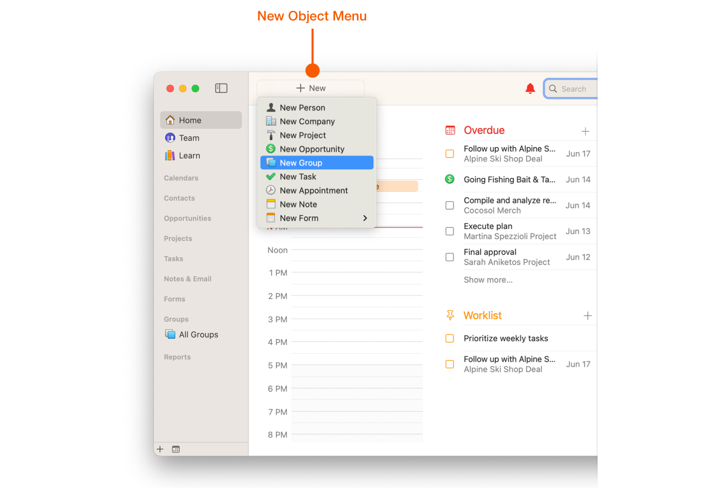 Groups differ from Opportunities or Projects in that they are not an objective which can be checked off when done. They are used for lists of People, Companies, Opportunities and Projects.