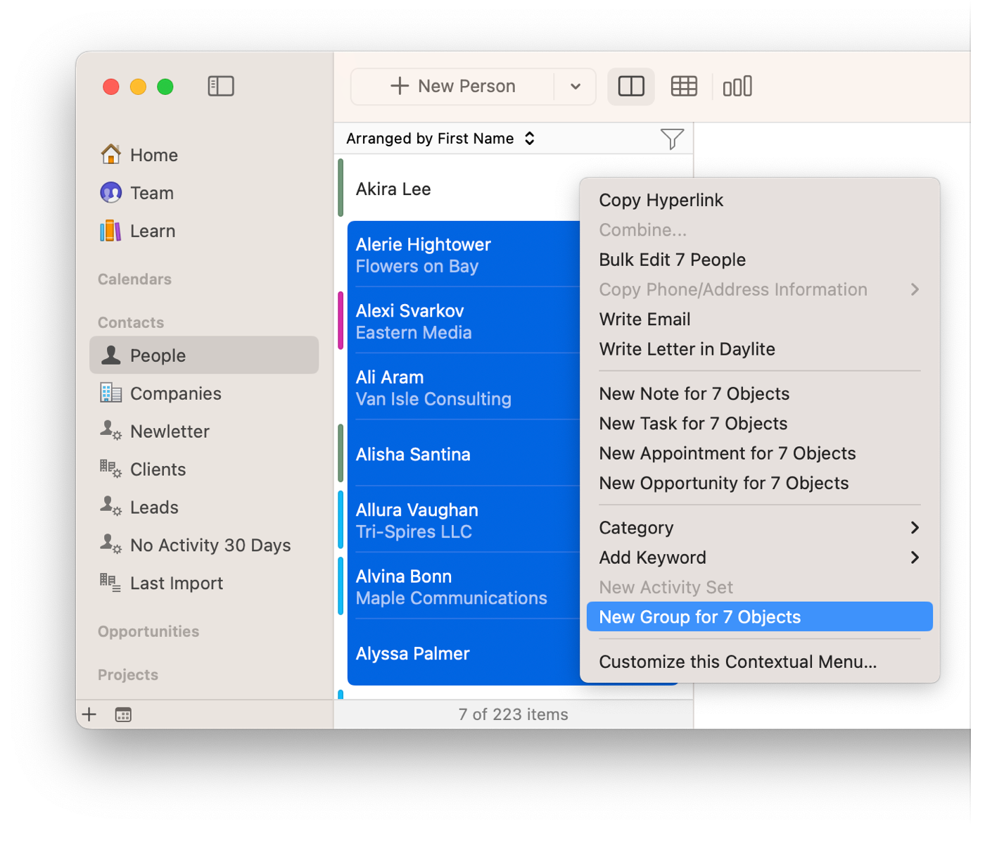 Groups can also be used to organize People who are part of different email marketing campaigns. For example, DirectMail is a mass email software product that integrates with Daylite.