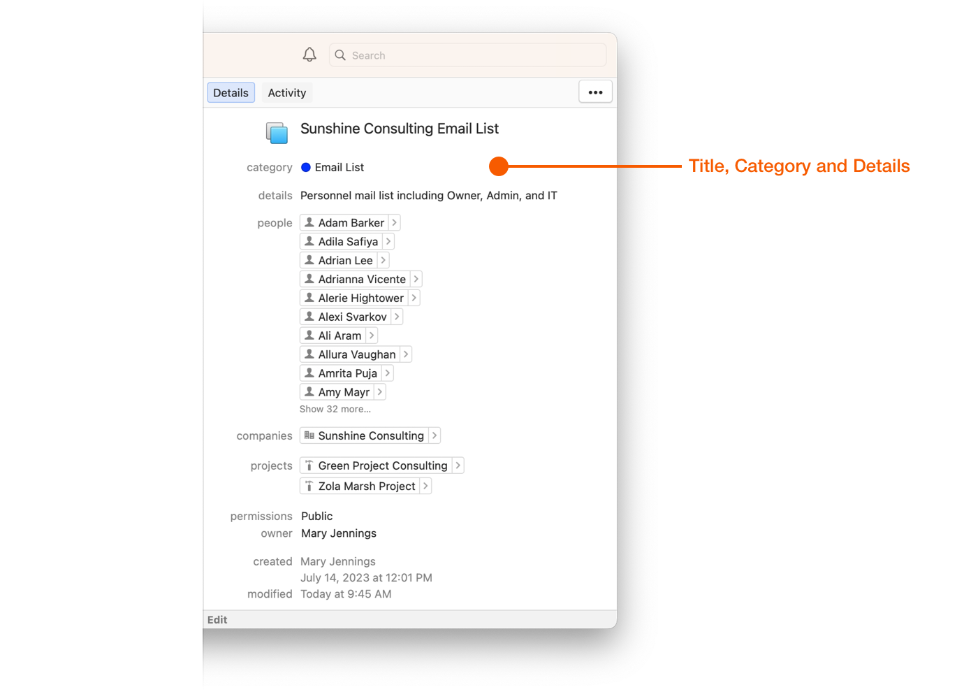 This shows the People that are currently linked to this Group. You can additional People by drag and dropping, or Linking them from Edit mode or using Cmd+L.