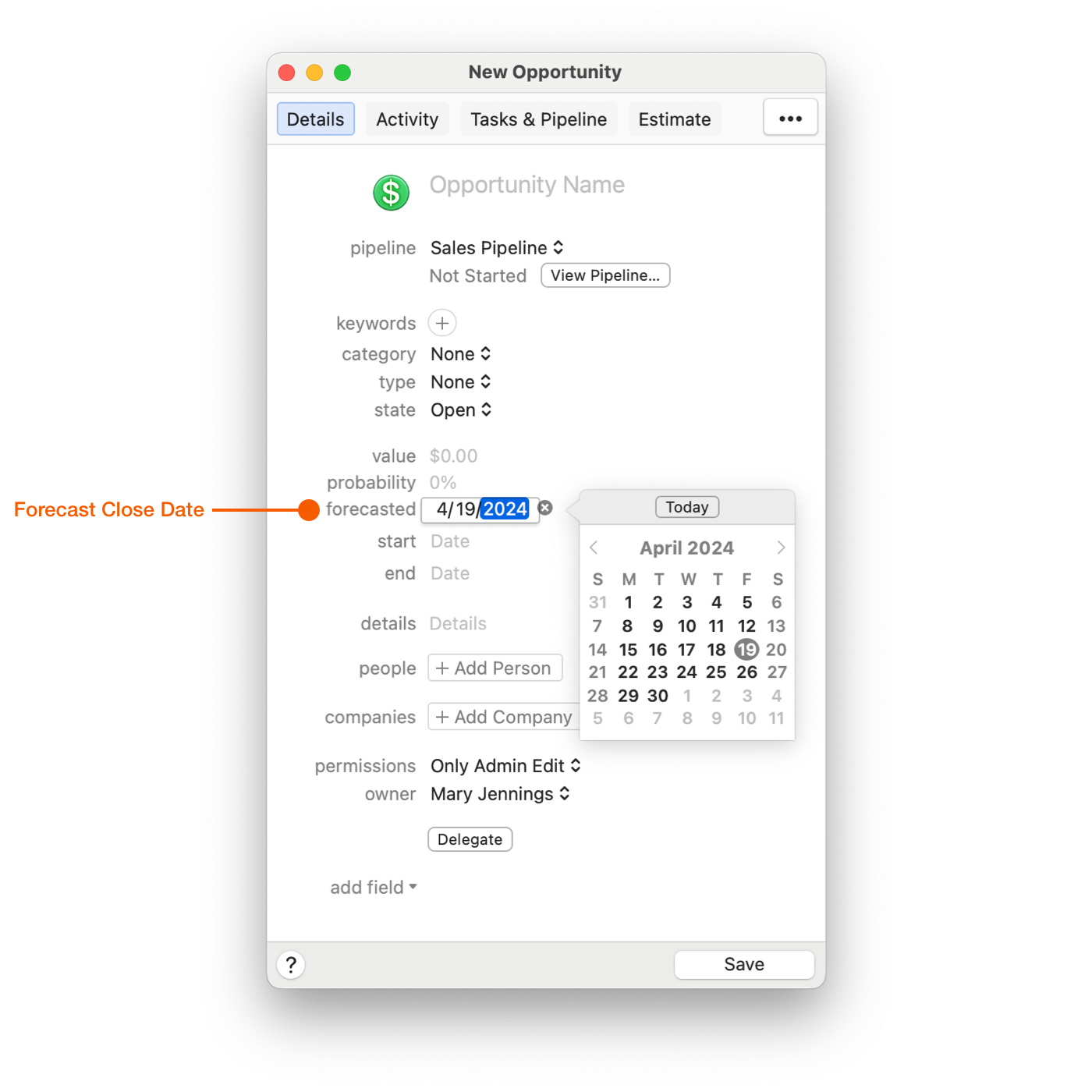 <figure><img src="https://4293187824-files.gitbook.io/~/files/v0/b/gitbook-x-prod.appspot.com/o/spaces%2Fyn0qJKdoNp6M4xqrQfMG%2Fuploads%2F8k37eQhKHZ8cqyXeZYIt%2Fforecast-close-date%5Cnew-opportunity.png?alt=media&#x26;token=1e64621f-bbf8-4270-b65d-97fd9e5244f2" alt=""><figcaption></figcaption></figure>